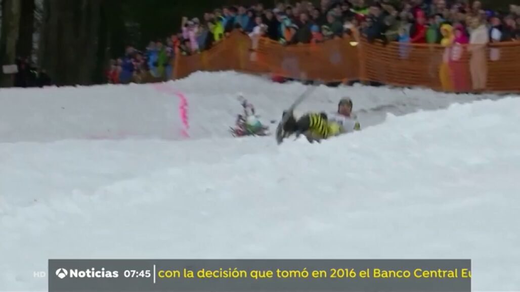 Una carrera de trineos, típica del Estado alemán de Baviera, nos ha dejado grandes imágenes de esta peculiar competición. Algo más de un kilómetro y medio por una pista forestal que termina con difíciles saltos.