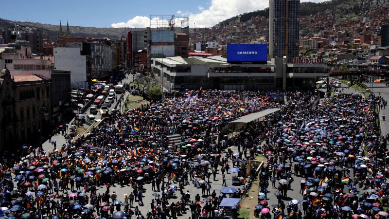 La Constitución boliviana no prevé ni siquiera esa figura, sino el estado de excepción. Morales compareció a primera hora de la mañana en la sede de su Gobierno en La Paz, por primera vez desde la noche electoral del domingo y después de que las protestas por el temor a un fraude en el recuento se extendieran desde entonces por el país. El mandatario empleó una advertencia recurrente en su discurso en sus trece años en el poder: la derecha opositora maquina el golpe. Para evitarlo apeló a la "movilización pacífica" de los suyos y pocas horas después centenares de campesinos, mineros, indígenas, sindicalistas y funcionarios estatales marchaban por el centro de La Paz coreando "Evo no está solo".