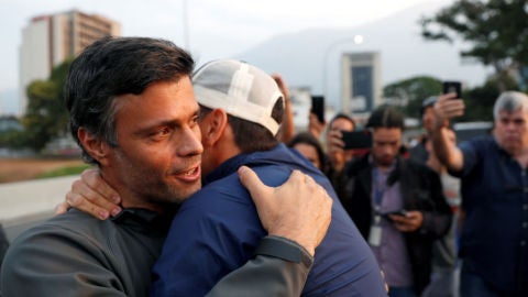 Leopoldo López, quien fue liberado el pasado 30 de abril por militares rebeldes, se encuentra ahora junto a su familia, su mujer Lilian Tintori y su hija, refugiado en la residencia del embajador español en Caracas "por voluntad propia".