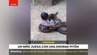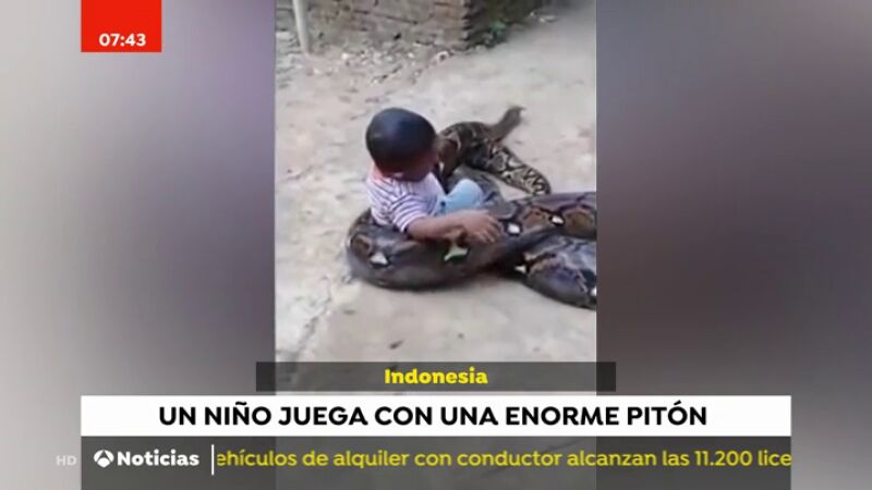 Graban a un niño jugando tranquilamente con una enorme y peligrosa pitón