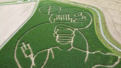 Un agricultor de Alemania ha creado un laberinto que, desde lo alto, simula a una persona recibiendo la vacuna contra la COVID-19. Se puede observar a una persona con la jeringuilla en el brazo, tubos de ensayo y un microscopio. El laberinto se abría al público el viernes pasado y en él hay juegos ocultos para los visitantes.