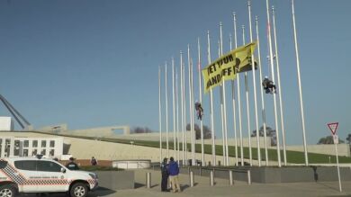 Activistas de GreenpeaceAustralia han escalado las astas de las banderas delante del Parlamento en Camberra para pedir al nuevo primer ministro australiano, Scott Morrison, políticas contra el cambio climático y protestar contra los grupos de presión de la industria del carbón.