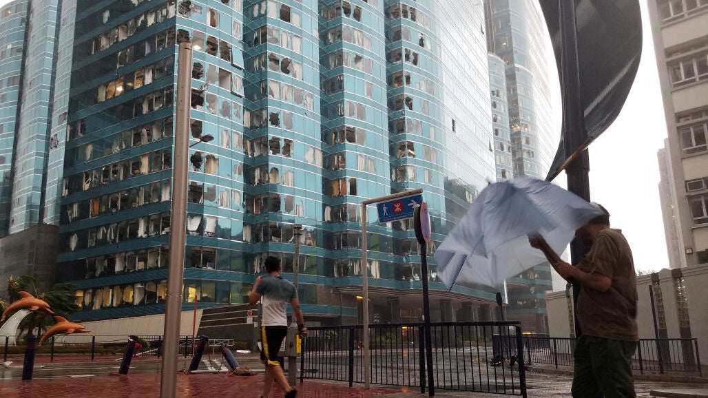 El tifón Mangkhut arrasa con todo lo que hay a su paso en Hong Kong, donde el mar se ha adentrado en la ciudad y el agua se ha colado dentro de los edificios. El viento ha arrancado las ventanas de algunos rascacielos y andamios de obra, además inundar aparcamientos y miles de locales comerciales.