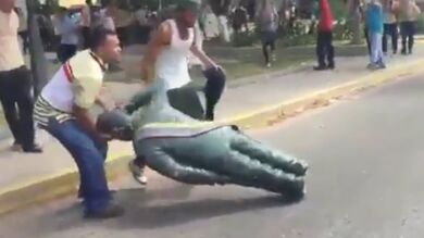 El partido venezolano Acción Democrática ha publicado en sus redes sociales un vídeo en el que se puede ver cómo un grupo de personas logran derribar la estatua, de unos dos metros de altura, y la van lanzando en repetidas ocasiones contra el suelo, mientras ésta se va despedazando.