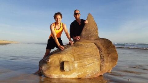 Dos pescadores han descubierto un pez gigante de 1,8 metros de largo varado en una playa en el sur de Australia. Las imágenes de esta extraña especie, conocida como 'pez luna del océano', se han vuelto virales en las redes sociales.