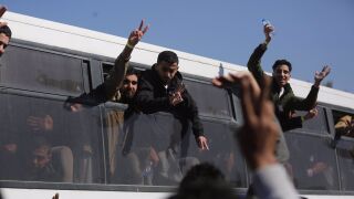 El autobús de la Cruz Roja con los primeros presos palestinos liberados salió de la prisión israelí de Ofer y fue una media hora lo que tardó en llegar al Palacio de Cultura de Ramala, donde decenas de personas esperaban a los presos, que salieron del vehículo vestidos con chándal verde y con pañuelos palestinos al cuello, según la retransmisión en directo de la cadena catarí 'Al Jazeera'.