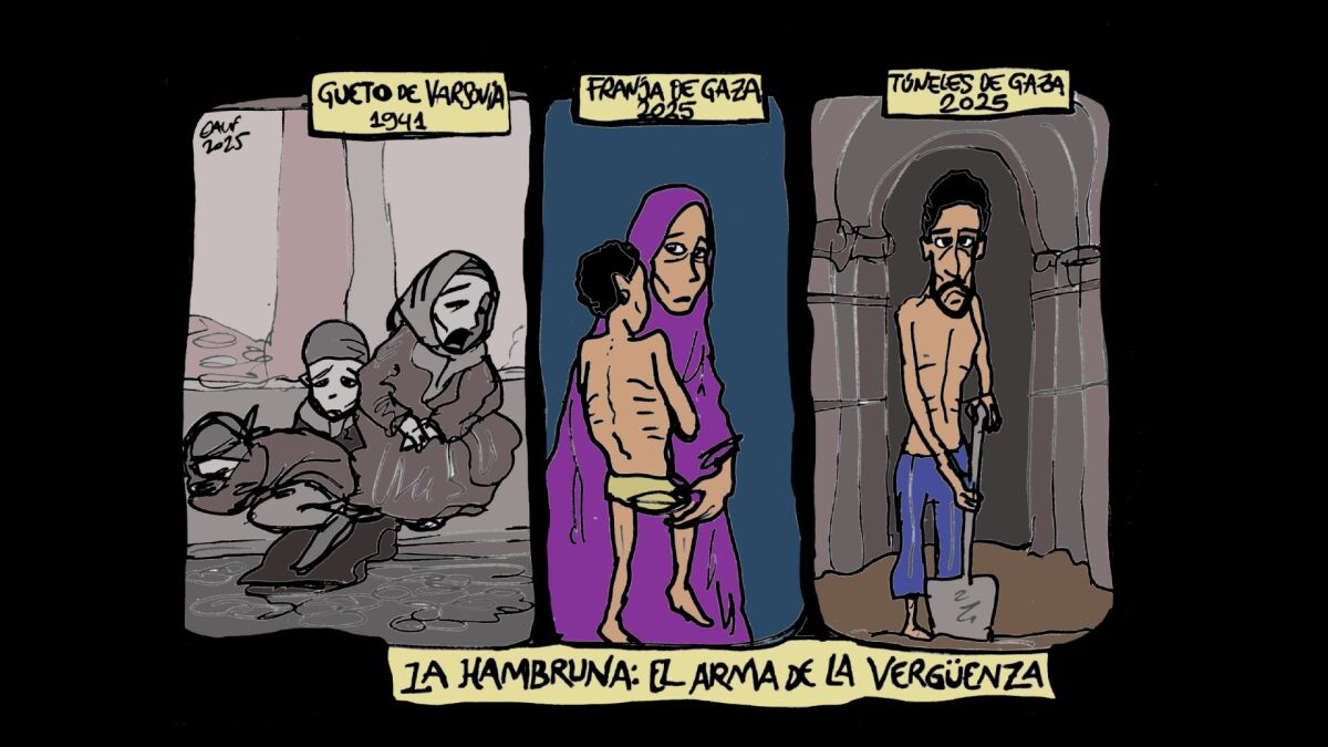 La viñeta de Antena 3 Noticias, un retrato sobre la situación extrema que se vive en la Franja de Gaza desde que comenzó la guerra: el hambre, las bombas, rehenes excavando su propia tumba... El autor, Alfredo Boto, ha plasmado "la hambruna como abominable arma de seres humanos contra seres humanos desde la historia de la Humanidad". Desde la Segunda Guerra Mundial hasta la actualidad con la guerra entre Israel - Gaza.