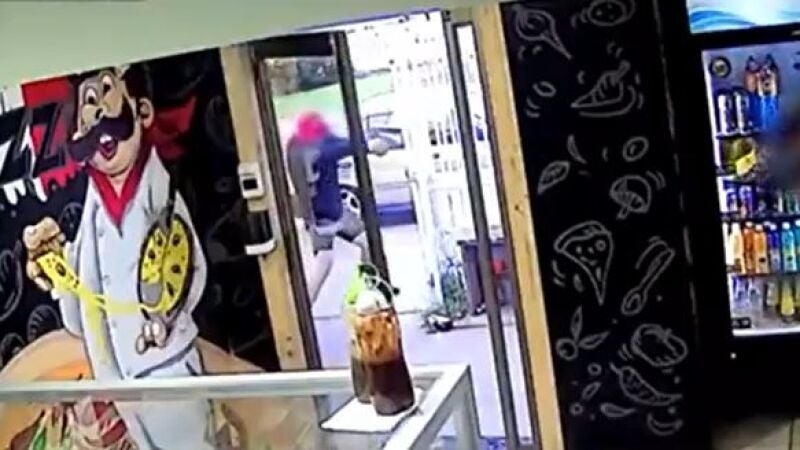 La cámara de seguridad capta como dos jóvenes entran al local, piden su comida, conversan de manera distendida con el dueño, y en el momento en el que van a salir, un hombre aparece con una pistola y comienza a disparar.