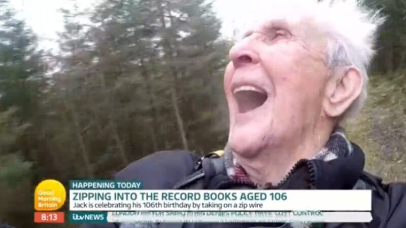 Un jubilado ha batido su tercer récord mundial Guinness en su 106º cumpleaños al convertirse en la persona de más edad que ha montado en una tirolina. Daredevil Jack Reynolds, de Derbyshire, dio un paseo en la tirolina de 60 metros de alto y 400 metros de largo en directo en el programa de televisión británico Good Morning Britain, de ITV, para recaudar fondos para la Stroke Association, una asociación de dedicada a personas que han sufrido un derrame cerebral.