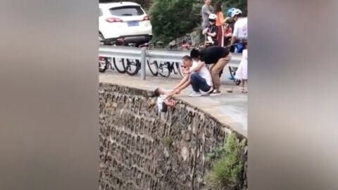 Un hombre de China ha desatado la indignación en las redes sociales tras ser captado colocando a su hijo en el borde de un acantilado para hacerle fotos. El vídeo grabado por un transeúnte muestra el momento impactante en que el padre lo cuelga sobre la empinada pendiente, mientras un chico toma fotos al pequeño.