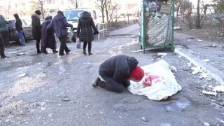 En un bombardeo ha muerto una mujer en un edificio residencial de 16 plantas. Su hijo llora su pérdida.