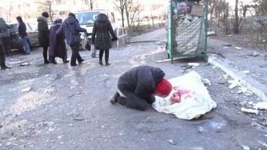 Un hombre llora junto al cadáver de su madre tras el impacto de un misil ruso en un barrio residencial en Kiev