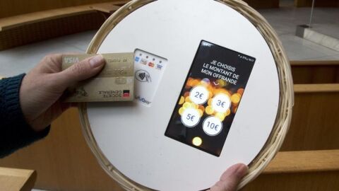 Una iglesia católica de París ha instalado un 'cepillo electrónico' para que los feligreses puedan hacer sus donaciones con la tarjeta de crédito mediante el método de 'contactless'.