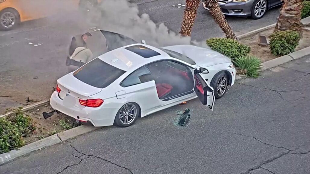 Impresionante rescate del fuego en Las Vegas. Un policía ha salvado a un conductor justo cuando su coche comenzaba a arder. Se desmayó después de chocar contra una palmera. Un hombre que pasaba por la zona ayudó al agente. Justo en el momento en el que le rescatan, el coche se incendia por completo, como es posible apreciar en las imágenes que acompañan esta noticia. El hombre ha resultado herido, pero se encuentra fuera de peligro.