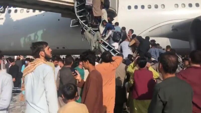 Varios vídeos difundidos en redes sociales muestran a un tumulto de personas empujándose y trepando unos sobre otros para acceder a un avión. Se agarran a las ruedas, a las escaleras de acceso, incluso al fuselaje. Entre ellas, también niños.