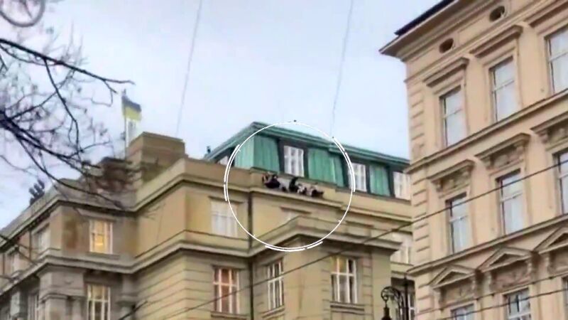 Impactantes imágenes de estudiantes de la universidad de Praga en la cornisa de un edificio intentando ponerse a salvo del tiroteo