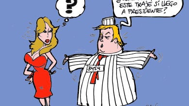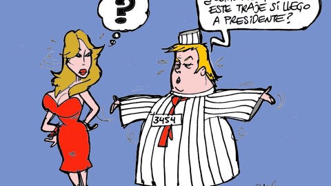 El ilustrador Alfredo Boto Hervás ha plasmado en la viñeta de la semana la situación que enfrenta en estos momentos el expresidente de Estados Unidos por múltiples cargos federales. En la viñeta se ve al propio Trump hablando con su mujer Melania, a la que le pregunta por su futuro. "Sólo por curiosidad, ¿cómo me quedaría este traje si llego a presidente?", pregunta el exdirigente.