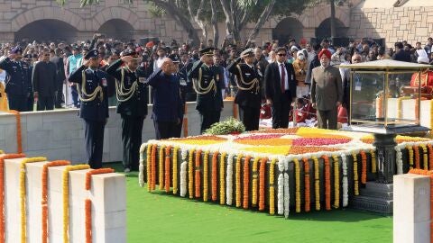 El presidente realizó un saludo de honor al monumento en memoria de Gandhi y depositó pétalos de rosa sobre la plataforma, hasta donde se acercaron también la ministra de Defensa, Nirmala Sitharam, o el jefe del Ejército, Bipin Rawat. Otros, como el líder de la oposición, Rahul Gandhi, del Partido del Congreso, le rindieron tributo en el lugar donde el 30 de enero de 1948 el padre de la patria recibió tres tiros por parte del integrista hinduista Nathuram Godse y que hoy forma parte de un museo.