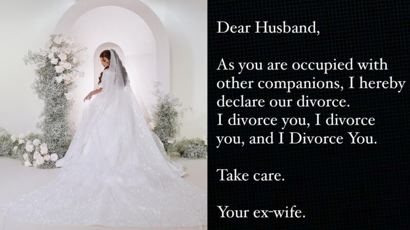 "Querido marido: como estás ocupado con otras compañeras, por la presente declaro nuestro divorcio. Me divorcio de ti, me divorcio de ti y me divorcio de ti. Cuídate. Tu ex esposa", ha expresado Mahra, de 30 años, en una publicación de Instagram, red social en la que cuenta con 722 mil seguidores.