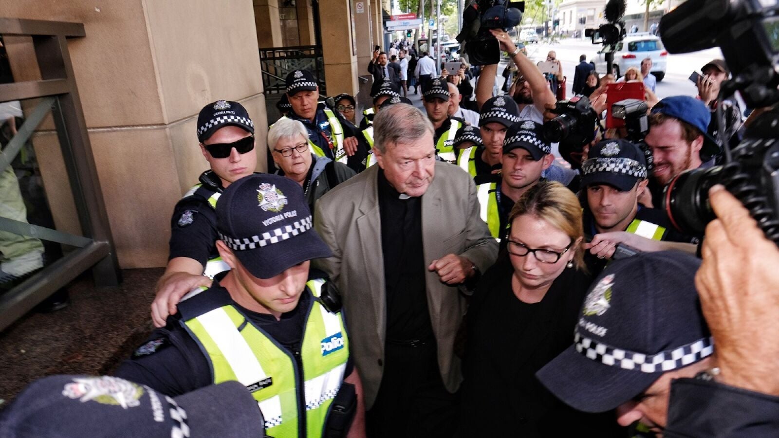 El prelado australiano, de 76 años, vestido con una chaqueta beige, camisa negra y alzacuellos, entró al tribunal en silencio y rodeado de una veintena de agentes de la Policía, mientras una mujer le gritaba con rabia: "vete al infierno George Pell". Durante la sesión abierta al público y a la prensa, el abogado de Pell, Robert Richter, criticó a la Policía del estado de Victoria, que acusó al prelado en junio del año pasado, por no haber seguido el protocolo para investigar a personas prominentes.