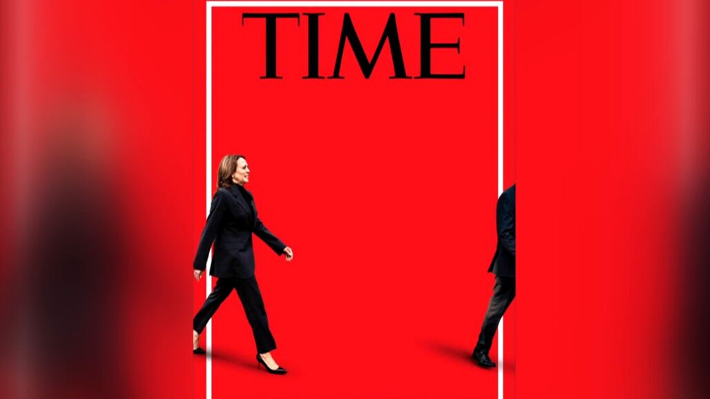 Joe Biden sale de plano mientras Kamala Harris entra a escena con paso firme, en la portada de la revista Time