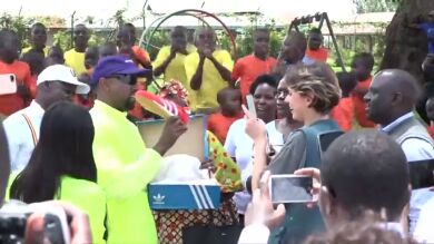 La pareja formada por Kanye West y Kim Kardashian realizó este pasado martes una visita guiada por las instalaciones de un orfanato acompañada del Ministro de Turismo. Tras repartir las camisetas y zapatillas que habían traído y charlar un rato con los niños y los locales de la comunidad, Kanye prometió que volvería para traer más suministros, recursos, arquitectos, médicos y músicos.