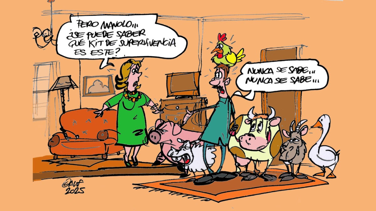 En este contexto, la viñeta de Alfredo Boto ironiza sobre las recomendaciones de la Comisión Europea. En la imagen se aprecia a un hombre llamado Manolo ha decidido formar su propio kit de supervivencia, pero en lugar de almacenar agua o alimentos enlatados, ha llevado a su casa a varios animales de granja: una vaca, un cerdo, una oveja, una cabra, un ganso e incluso un gallo que lleva sobre su cabeza. Su esposa, sorprendida, le pregunta: "Pero Manolo, ¿se puede saber qué kit de supervivencia es este?". A lo que él responde: "Nunca se sabe… Nunca se sabe…". La viñeta refleja, con humor, la preocupación de los ciudadanos por estar preparados para una crisis.