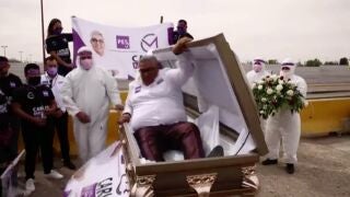 Es una extraña estrategia que ha utilizado un político en plena campaña electoral en México. Sumergido en un ataúd de forma simbólica para resaltar las muertes por el coronavirus.