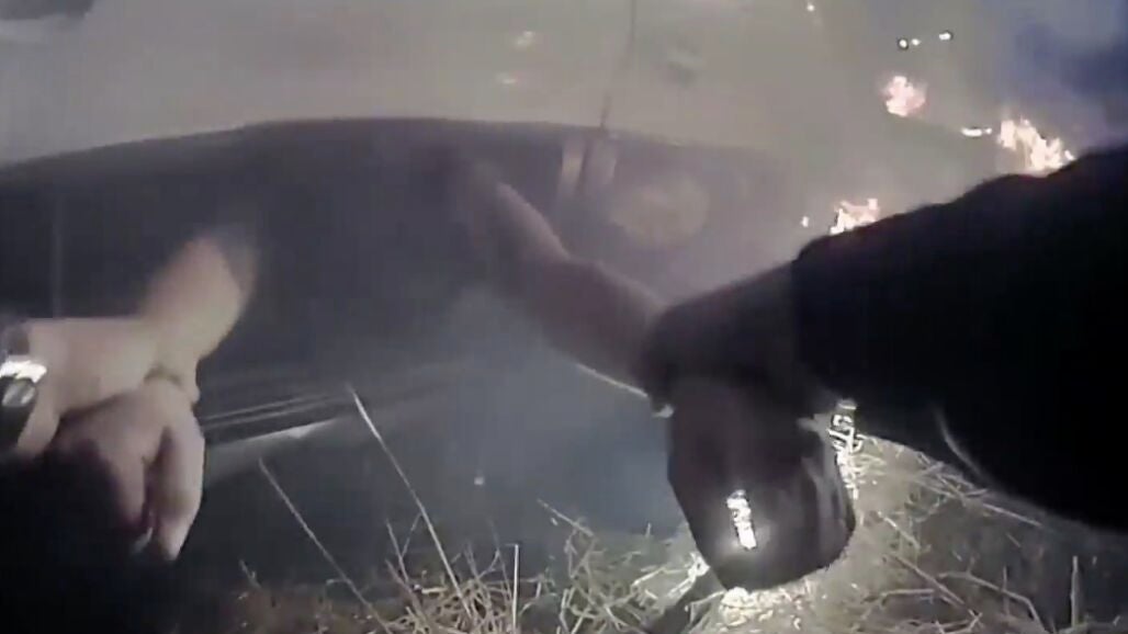 Una mujer es rescatada de entre las llamas por un policía cuando ella se encontraba atrapada en el interior de su coche en la autopista 80 en el norte de California, en Estados Unidos.