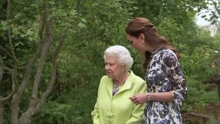 La monarca ha recorrido el frondoso jardín imaginado por Kate para la última edición del Chelsea Flower Show. La duquesa ha diseñado un jardín con casa en un árbol, columpio y un arroyo donde mojarse los pies.