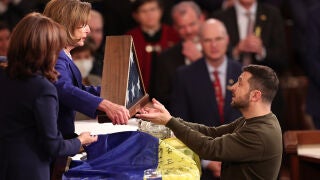 Una intervención en la que el presidente de Ucrania ha dado un discurso épico de aproximadamente media hora y en la que ha dejado claro que la ayuda de Estados Unidos "no es caridad, es una inversión en seguridad y democracia global que manejamos de la manera más responsable". "No nos rendiremos nunca" ha dicho firme y seguro. A su despedida, también entre aplausos, ha entregado una bandera firmada por soldados en el frente como agradecimiento y el ha recibido una de Estados Unidos.