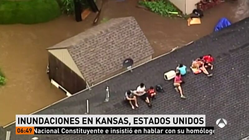 La ciudad de Kansas, en Estados Unidos, ha quedado inundada debido a las lluvias torrenciales que han caído durante dos días seguidos. Una familia ha tenido que resguardarse, incluida su mascota, en el tejado de su casa a la espera de los equipos de rescate.