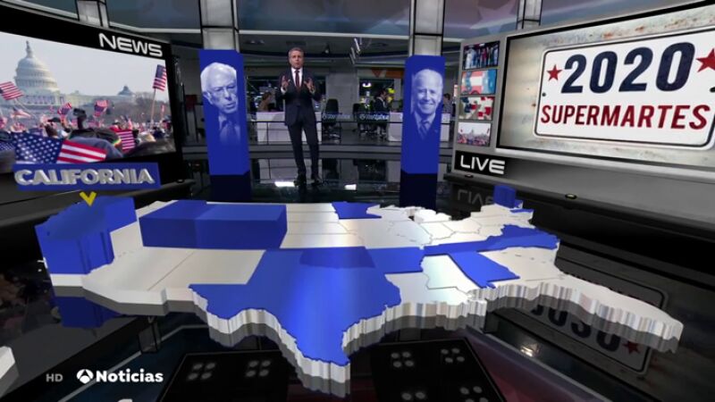 Las primarias del 'supermartes' de Estados Unidos se han colado en el plató de Antena 3 Noticias gracias a la realidad aumentada. Vicente Vallés ha explicado con todo detalle los resultados de las primarias demócratas.