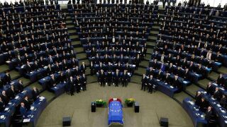 Los restos mortales, cubiertos por una bandera europea, se situaron en el salón protocolario de la Eurocámara para que aquellos que lo han deseado, poder despedirse de forma íntima y firmar en el libro de condolencias.