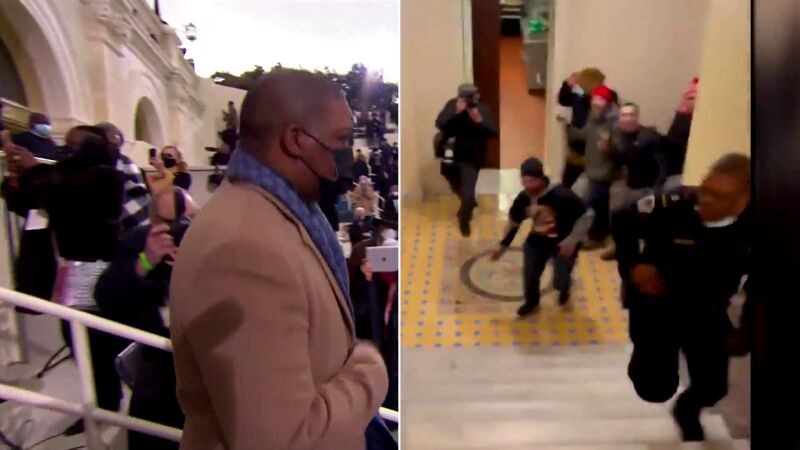 Aparece la vicepresidenta Kamala Harris y le escolta Eugene Goodman; es el policía, el héroe que distrajo a los atacantes del Capitolio en el asalto del pasado 6 de enero por parte de los partidarios de Donald Trump. La primera mujer vicepresidenta de EE.UU. iba vestida de morado, el color de la unión entre azul y rojo. Un guiño a la unidad de ambos partidos y homenaje a las primeras sufragistas; el mismo elegido también por Hillary Clinton.