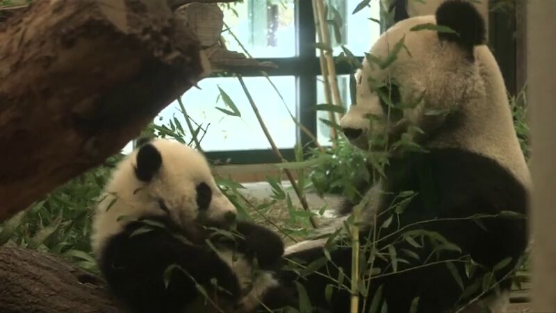 Los cachorros de panda se pueden ver rodando, jugando y escalando las ramas de los árboles. Mientras que la pareja de pandas mordisquea las hojas tiernas de bambú, la madre Yang Yang todavía los amamanta una o dos veces al día.
