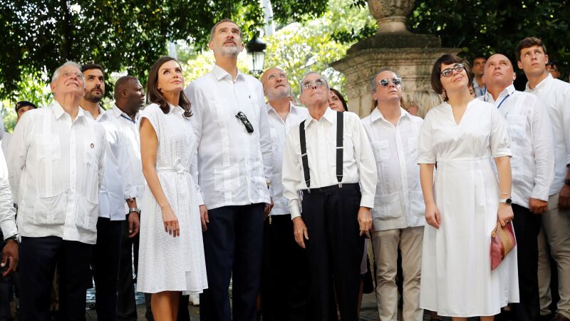 Felipe VI, de nuevo con guayabera, esta vez blanca, y la reina, con un vestido del mismo color, iniciaron el recorrido en el Templete, el punto donde en 1519 se celebró el primer cabildo y la misa fundacional junto a una ceiba.