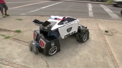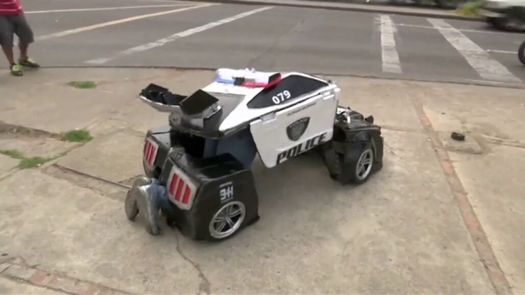 El 'transformer humanoide' Luis René Cruz se convierte en coche de policía y patrulla por las calles de Bogotá