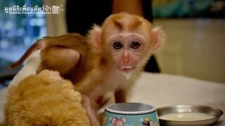 Mongkood es un macaco de cola de cerdo que ha sido adoptado por la asociación Wildlife Friends Fundation Tailandia después de que un cazador furtivo matara a su familia y lo vendiera como mascota en el mercado negro.