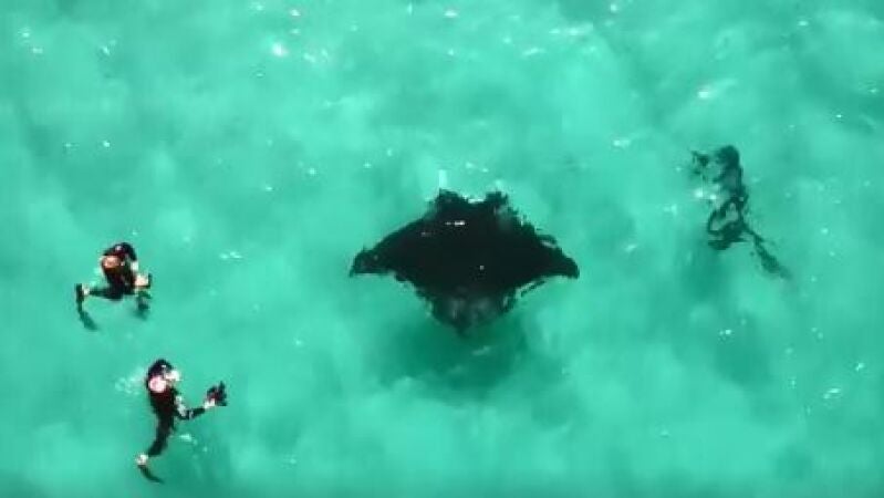 El pescado, que se trata de una mantarraya, se acercó a un grupo de buceadores para pedir que le quitaran los ganchos que tenía en los ojos en Australia.