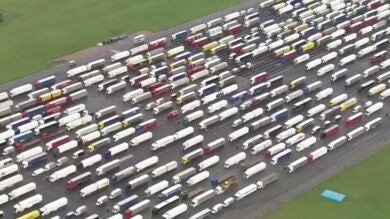 Cientos de transportistas se han quedado bloqueados en el Reino Unido tras el cierre del eurotúnel, por donde llega el 20% de los alimentos y medicinas al país desde el continente, lo que ha provocado que se acumulen los camiones a lo largo de varios kilómetros.
