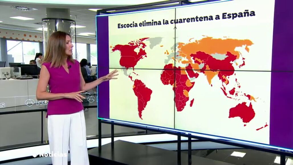 El mapa muestra en rojo los países a los que los españoles no podemos viajar, al menos de momento. Entre los que imponían cuarentena, en naranja, estaba Escocia, pero ya a finales de esta semana los que viajen allí no tendrán que guardarla. Eso sí, deberán rellenar un formulario para poder estar siempre localizados, so pena de multa de 66 euros.