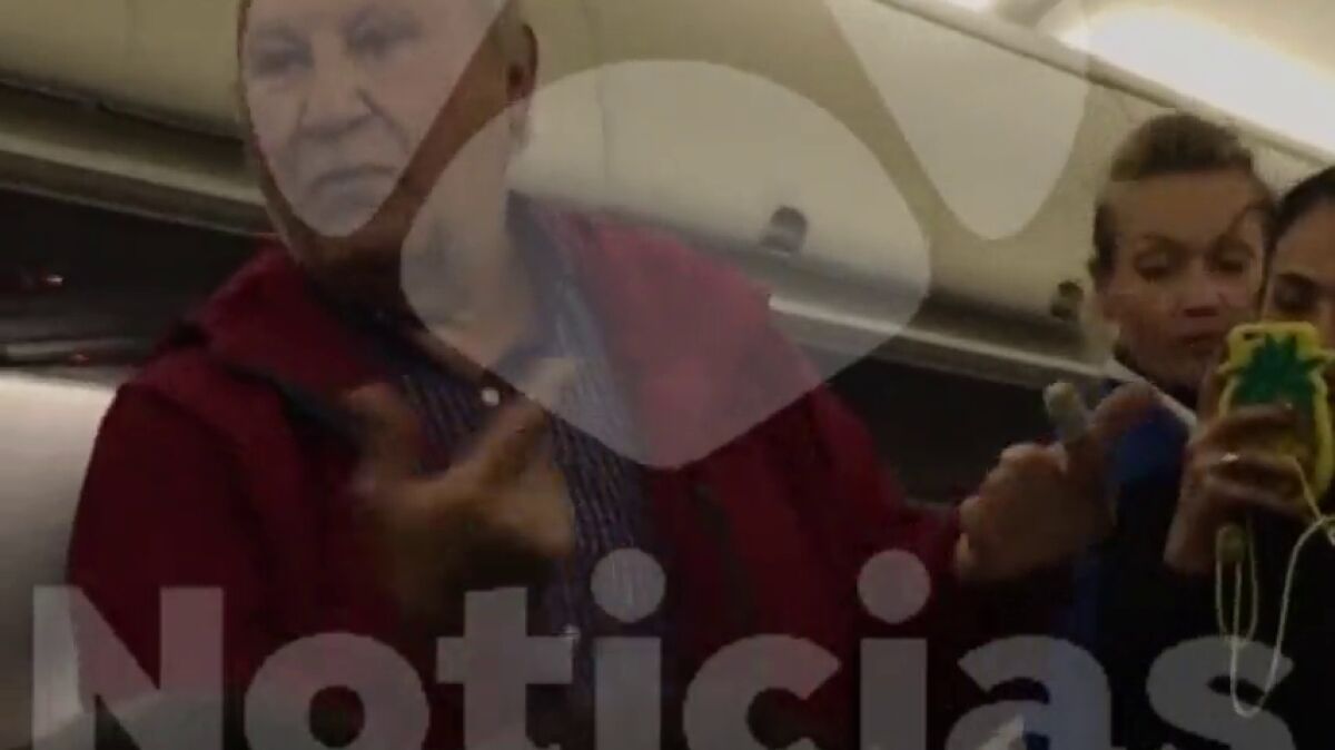 El origen del momento de tensión fue que uno de los azafatos del vuelo cogió el equipaje de mano del anciano para reubicarlo en otro espacio y el hombre no entendía el motivo. Le preocupaba que dentro llevaba un ordenador y decidió pedir explicaciones, en repetidas ocasiones, al azafato, pero al no entenderse, el enfado fue a más. Como muestran las siguientes imágenes, la mujer intento sin éxito intermediar entre su marido y el hombre de la compañía.
