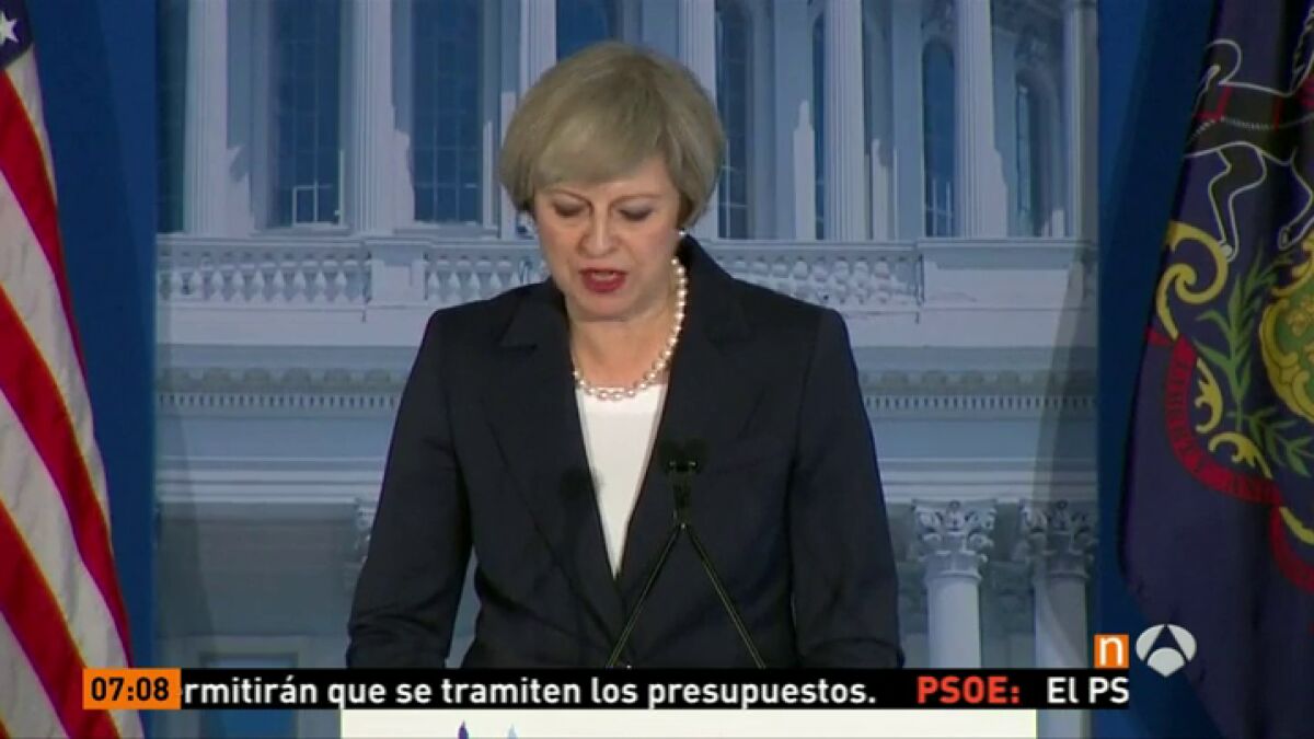 La primera ministra británica subrayó que, a pesar de la decisión del Reino Unido de abandonar la Unión Europea (UE), le interesa que el bloque europeo "tenga éxito", y que su país quiere adoptar un papel "aún más global e internacionalista". "Los días del Reino Unido y Estados Unidos interviniendo en países soberanos en un intento de rehacer el mundo a nuestra imagen y semejanza se han acabado. Pero no podemos quedarnos de brazos cruzados cuando las amenazas sean reales", alertó May.