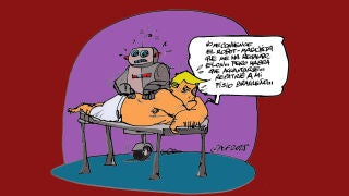 En la imagen podemos ver a a Donald Trump recibiendo un masaje por un robot. "No me convence el robot masajista que me ha regalado Elon... Pero habrá que aguantarse. Repatrié a mi fisio brasileño...", dice el presidente estadounidense en la viñeta.