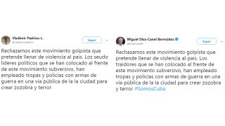 El tuit del presidente cubano habría pasado desapercibido como un mensaje más de apoyo al régimen de Nicolás Maduro, si no fuera porque es exactamente idéntico al publicado horas antes por el ministro de Defensa de Venezuela, hasta el punto de reproducir la misma errata: "la la ciudad".