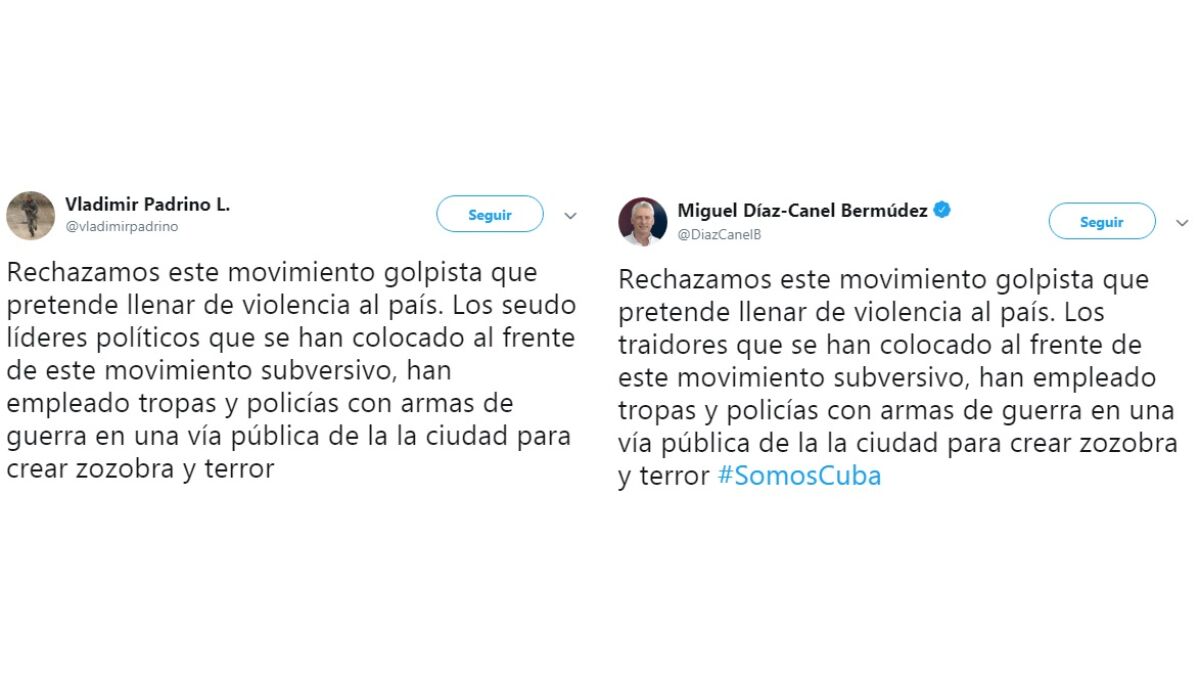 El presidente de Cuba, Miguel Díaz-Canel, escribió el martes un tuit idéntico al publicado inmediatamente antes por el ministro de Defensa de Venezuela, Vladimir Padrino, un aparente "copia y pega" que ha suscitado numerosas reacciones en la red, desde el enfado hasta el sarcasmo.