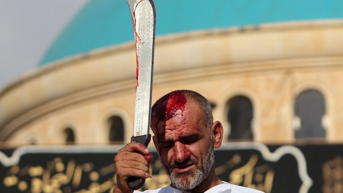 Cientos de chiíes iraquíes han celebrado la Ashura, festividad que conmemora la muerte del imán Husein, nieto del profeta Mahoma, con el ritual de herirse la cabeza con un arma blanca hasta hacer brotar sangre.