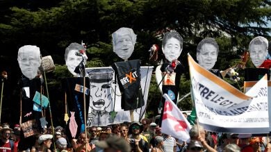 Miles de personas iniciaron una marcha desde el puerto francés de Hendaya en protesta contra la reunión del G7 que se desarrolla desde este sábado en la vecina Biarritz, encabezadas por una pancarta que lleva el lema 'No al G7, construyendo otro mundo desde Euskal Herria'.