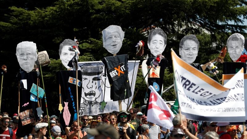 La pancarta la portan, entre otros, la secretaria general del sindicato LAB, Garbiñe Aranburu, y el secretario general de Sortu Arkaitz Rodríguez. Detrás de ella miles de personas corean consignas y agitan banderas de los diferentes colectivos que participan en la 'contracumbre' que se desarrolla de forma paralela a la reunión que el G7 celebrará en Biarritz (Francia).